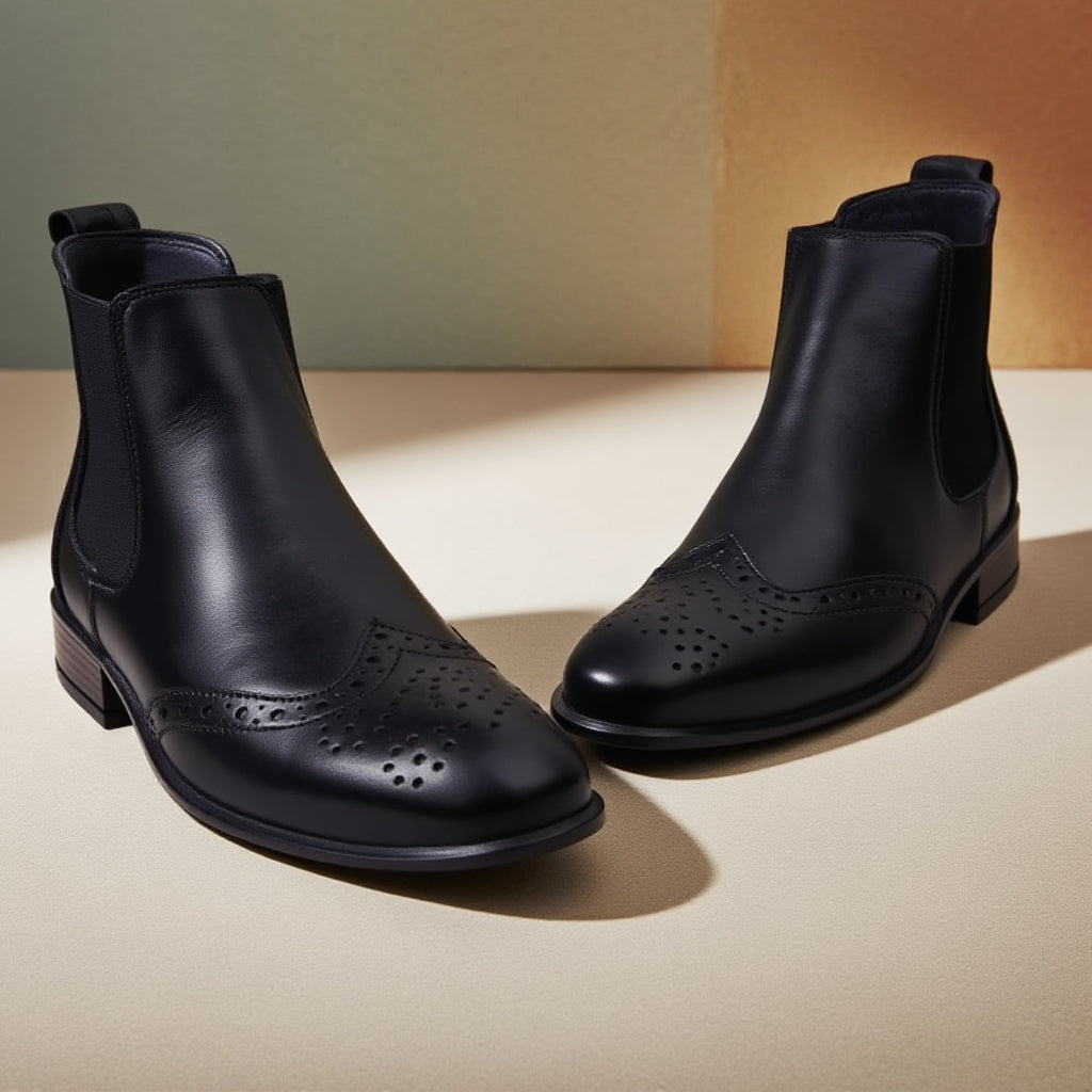 Elevate your formal edge with the LOGANSTER Noir Regent Chelsea — a bold fusion of classic brogue detailing and sleek Chelsea boot design. Crafted from premium black leather with intricate perforations on the toe cap, these boots command attention in boardrooms and evening lounges alike. Built for the modern gentleman who values precision, polish, and powerful presence with every step.